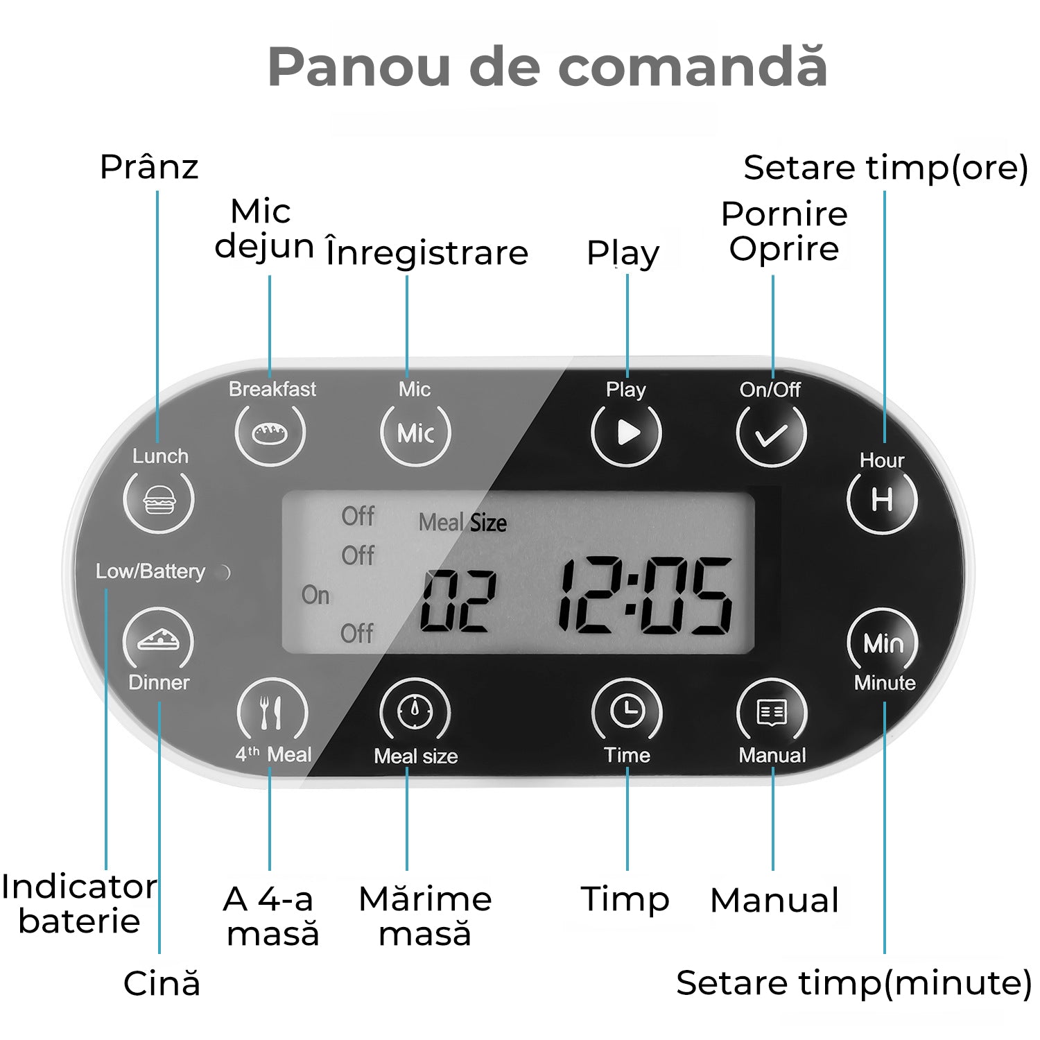 Cu ajutorul funcției de timer, poti programa cu usurinta orele exacte de hranire, asigurandu-te ca animalul tau primeste hrana la intervale regulate si in cantitatile potrivite. Mai mult decat atat, dispozitivul nostru inovativ permite inregistrarea unui scrut mesaj vocal, care se va reda automat in timpul hranirii, oferind astfel un element personalizat si reconfortant pentru companionul tau.